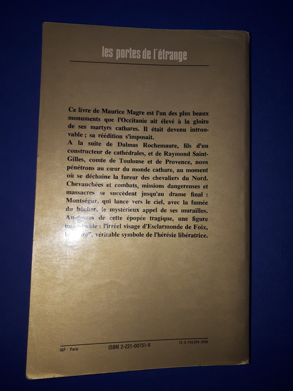 à l'aube du XIIIème siècle, le fils d'un bâtisseur de cathédrale se sait investi d'une mission : sauver l'Occitanie de la tuerie de Béziers, où Dieu n'a pas reconnu les siens, jusqu'à Minerve et l'attentat d'Avignon. Nous suivons le parcours initiatique du jeune écuyer du Comte de Toulouse. Déposant un rai de lumière sur ce secret que l'on croyait à jamais perdues dans les cendres du tragique bûcher de Montségur, cet ouvrage - à la fois mystique et sensuel - a été le premier à dévoiler les arcanes de la doctrine cathare et fut à l'origine du mythe d'Esclarmonde, symbole de l'hérésie libératrice.
