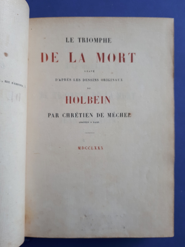 [Paris, Imprimerie Simon Raçon et Comp.,]. Petit in-4°, maroquin aubergine, double filet et des plats richement décorés, fleuronnés, dos orné de compartiments fleuronnés, roulette et filets intérieurs, tranches dorées (Bardisser). 47 planches gravées sur cuivre par Chrétien de Méchel d'après Holbein, numérotées 1-47, et une planche non numérotée représentant la Faucheuse menaçant la Terre. Chacune d'entre elles, hormis la dernière figure, est accompagnée d'un texte imprimé en regard sur un papier vergé fin.