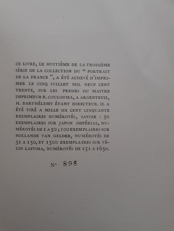 Célèbre collection des éd. Émile-Paul frères qui de 1926 à 1931 offrit à quelques écrivains la possibilité de vanter un coin de France. 34 titres parurent dans cette série dirigée par Jean-Luc Vaudoyer, élégante édition à la belle typographie agrémentée d'ornements, culs-de-lampe, lettrines et d'un frontispice, imprimés sur les presses du maître imprimeur R.Coulouma, le tirage était limité à 1 650 ex., 50 sur Japon, 100 sur Hollande van Gelder, le reste sur vélin Lafuma. L'exemplaire est sur vélin Lafuma avec un frontispice de l'auteur A noter sur la couverture de dos, une marque ( Cf. photo ) d'adhésif qui a très légèrement endommager cette dernière. Léger manque en tête du dos.