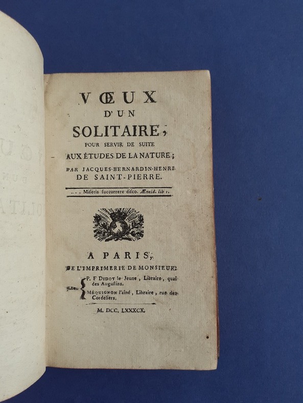 Edition originale de cet ouvrage qui fait suite aux « Etudes de la nature ». Ces vœux sont à l’attention du roi, du clergé, de la noblesse, au peuple, à la nation ou pour une éducation nationale.