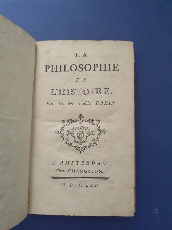 Bon exemplaire de cette précieuse réunion, la plus complète, qui servit à l'édition critique qu'en donna J. H. Brumfitt en 1963. La Philosophie de l'Histoire (ou d'après Brumfitt "les leçons que l'histoire enseigne aux philosophes "écrite pour instruire Madame du Chatelet est une vaste introduction à l'Essai sur les Mœurs dédiée à Catherine II de Russie. Voltaire découvre chez tous les peuples une constante: « la conscience de la justice » suivi de : Supplément à la philosophie de l'histoire de Feu M. l'Abbe Bazin et suivi de : [LARCHER] La Défense de mon Oncle contre ses infâmes persécuteurs par A…T de V***. Des sept éditions de la célèbre œuvre de Voltaire, portant la date de 1765, M. Brumfitt choisit celle qui est mentionnée sous le nom de l’Abbé Bazin, un des pseudonymes de l’auteur.