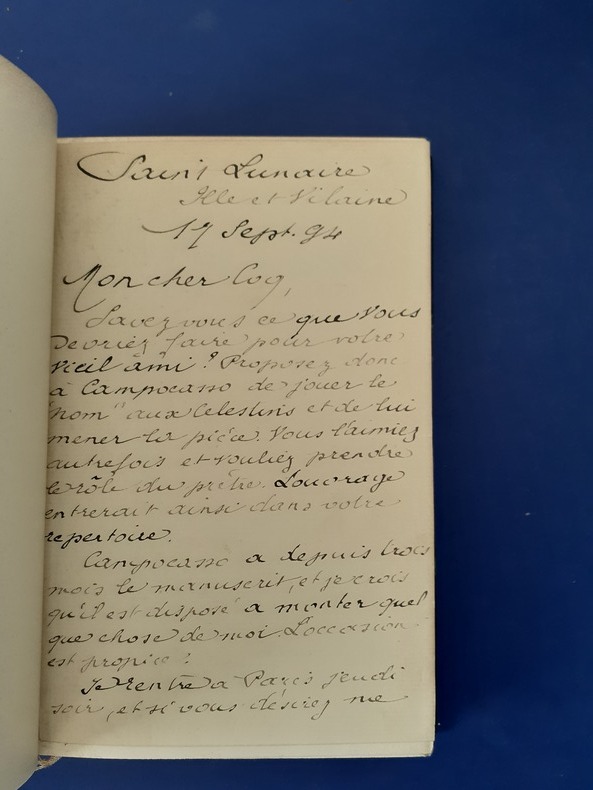 Reliure signée, demi à coins, ouvrage enrichi d'un envoi de Constant Coquelin destinataire de la lettre truffée de Bergerat Peu commun.