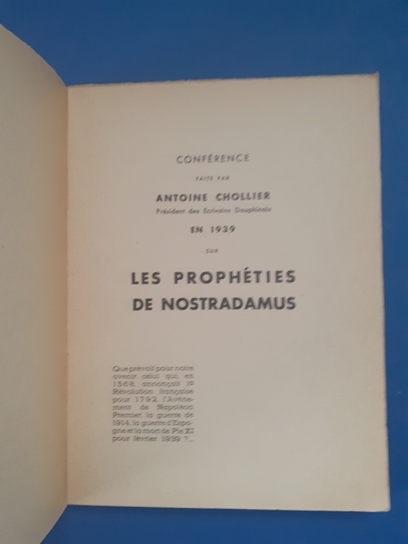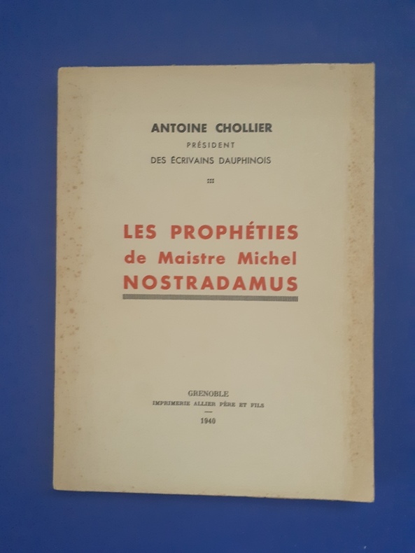 Grenoble 1940, in/8 broché, 54 pages. Conférence faite par Antoine Chollier en 1939 sur les Les prophéties de Maistre Michel Nostradamus.