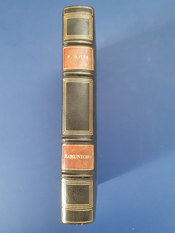 3 volumes in-8 (18 x 11,5 cm), demi maroquin rouge à coins (reliure de l’époque), couverture conservée, dos à nerfs orné et estampé à froid), tranche de tête dorée, ex-libris manuscrit de M. F. Imbault, [8]-351-[1] ; [6]-258 ; [6]-220-[2] pages (complet). Quelques rousseurs. État très correct.Nouvelles éditions de ces trois ouvrages rédigés par Pierre Loti (1850-1923), né Louis-Marie-Julien Viaud, écrivain et officier de marine français. La plupart de ses œuvres naît de ses propres expériences, de sa vie privée, ou encore de ses voyages : il évoque par exemple le Pays basque au sein de Ramuntcho. Agréables exemplaires.