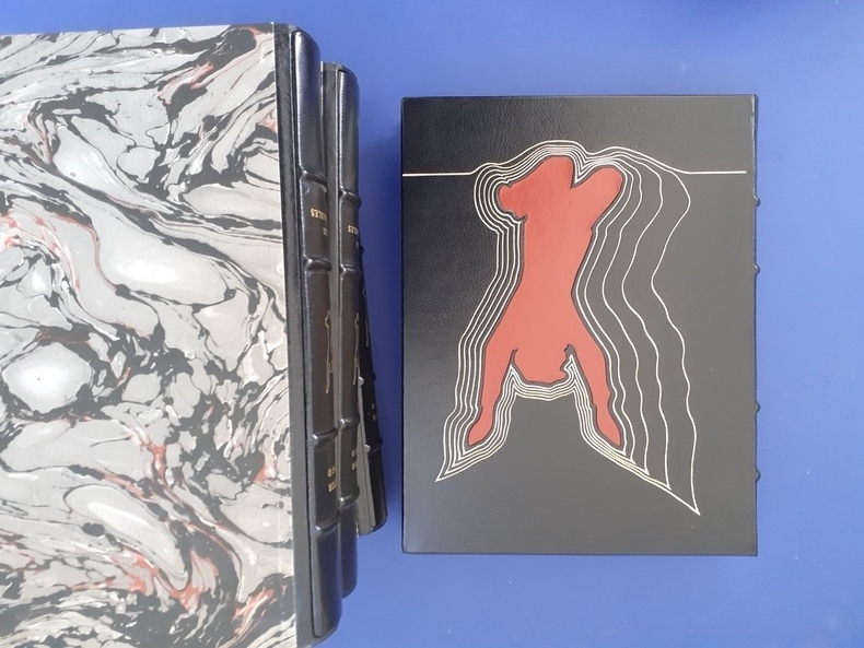 Editions André Sauret, 1983 4 v. l rel. plein cuir dos à nerfs, tranche de tête dorée, plat enrichi d'une dorure à chaud prune mosaïquée de cuir noir, sous étui, tranche supérieure dorée.