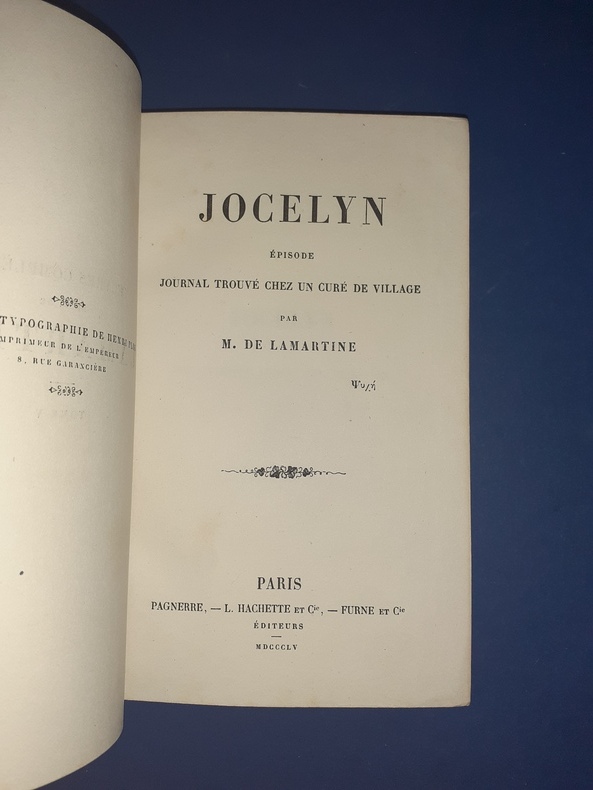 Première édition illustrée et premier tirage, dite édition "Keepsake", en partie originale, comportant 12 planches (frontispice compris) hors texte d'après Marckl, gravées sur bois par Quartley, Dujardin, Herbert, Piaud et Timms, vignettes sur bois dans le texte, et 10 titres-frontispices compris dans la pagination (Carteret III, p. 366 ; Vicaire, IV, 976-77; Talvart XI, 19E) — L'édition originale (non illustrée) date de 1836. – Jocelyn, poème de Lamartine, est le journal et la confession d'un prêtre. Jocelyn est entré au séminaire afin de pouvoir abandonner à sa soeur sa part d'héritage et lui permettre d'épouser l'homme qu'elle aime. Les événements de 1793 l'obligent à se réfugier dans une grotte solitaire des Alpes. Un émigré, poursuivi par les soldats, meurt dans la montagne en confiant à Jocelyn son fils Laurence. Les deux jeunes gens vivent dans les bois, pleins de santé et de bonheur, attirés l'un vers l'autre par de vagues désirs. Enfin, Jocelyn découvre que Laurence est une femme, et une femme qui l'aime tendrement. Un jour, Jocelyn est appelé auprès de son évêque, prisonnier et mourant. Le vieillard lui confère les ordres, afin de pouvoir se confesser à lui. Une soeur de charité va annoncer à Laurence le sacrifice de Jocelyn. Deux années se passent. Jocelyn est devenu curé de Valneige. Après avoir longtemps souffert, il a conquis la paix du coeur. Laurence, pour s'étourdir, s'est jetée dans les plaisirs du monde. Quelques années après, elle vient mourir dans la montagne où elle a vécu heureuse, et c'est Jocelyn qui reçoit sa confession. L'amour, à la fois ardent et chaste, des deux jeunes gens, la grandeur du sacrifice chez Jocelyn, la sérénité où son âme arrive à la fin, les descriptions de la nature amples et abondantes, une pensée philosophique élevée côtoyant parfois une poésie intime et familière, des épisodes de toute beauté comme ceux des Laboureurs, de I'ordination de Jocelyn, des funérailles de Laurence, tels sont les principaux mérites de cette oeuvre. (Imago Mundi)