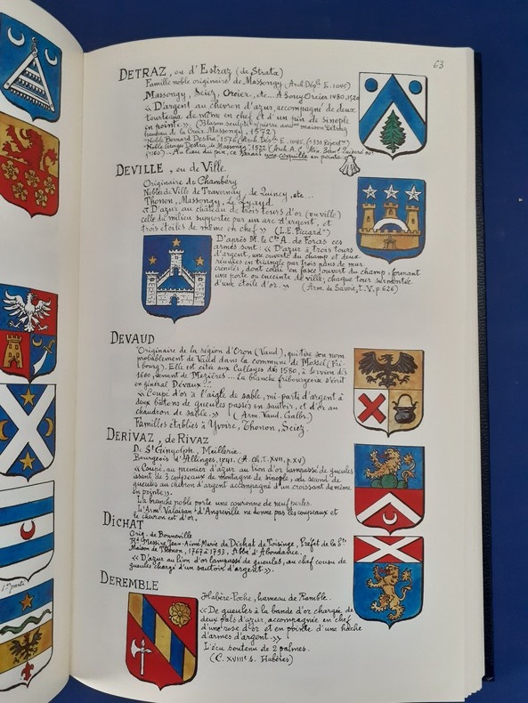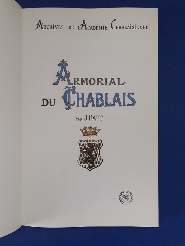 Genève, éditions Slatkine Reprints & Thonon-les-Bains, Archives de l'Académie Chablaisienne, 1993 In-4° de 274 pp., Contient: Armoiries du Royaume de Sardaigne, Chypre et de Jérusalem, Province de Chablais, Blasons des Villes (Thonon-les-Bains, Evian-les-Bains, Allinge, etc),