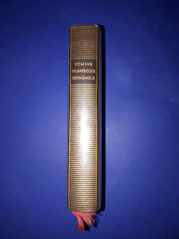 Reliure d'éditeur en plein cuir dos lisse strié de filets horizontaux dorés. Sous jaquette illustrée, rhodoïd, sans l'étui de carton gris. La vie de Lazare de Tormes, la vie de Guzmán d'Alfarache et La Vie de l'Aventurier Don Pablos de Ségovie