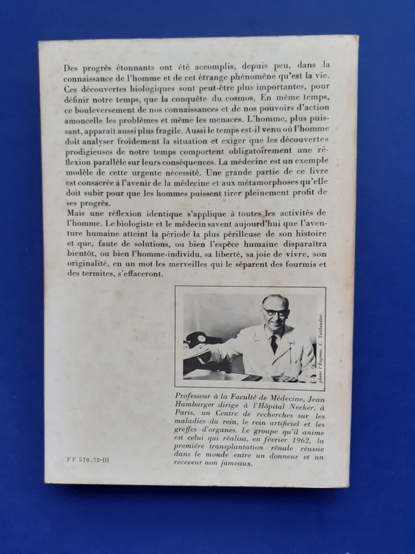 1ere édition Contents, Chapitres : Où l'on verra que la médecine et la biologie créent de l'homme une image renouvelée et inattendue - Où l'on tente de démontrer que dans les pays où la recherche est pauvre, les malades sont mal soignés - Où il sera plaidé que le médecin praticien doit être peu à peu délivré de sa solitude - Où l'on passe insensiblement de la médecine aux problèmes de l'homme - Où le médecin cherche à comprendre l'aventure humaine - Où l'on essaye de proposer des conclusions le haut supérieur gauche du volume est un peu corné (sur les plats et le dos), le livre est sinon en bon état, le papier tres legerement jauni