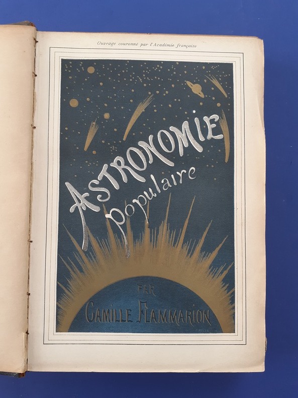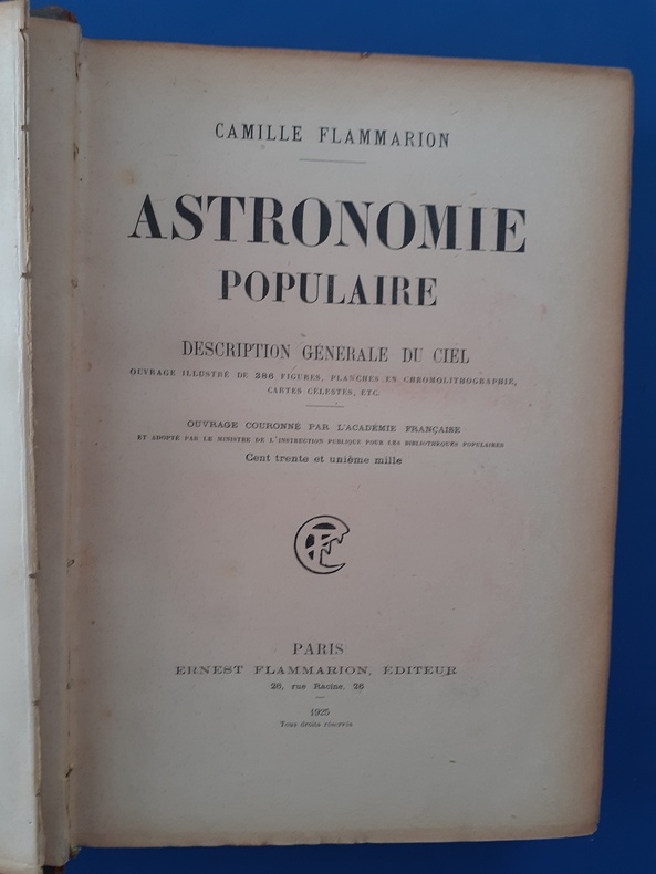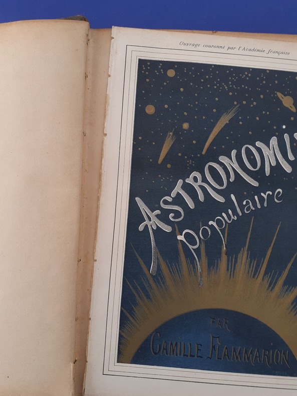 Flammarion, 1980, in-4 rel. cart. 19 x 28), 839 p.-XXXI, reproduction en fac-simile de l'édition de 1880, postface pour aider à la lecture de l'"Astronomie Populaire" de Jean-Claude Pecker, 360 figures, 8 planches tirées à part, couverture ill., tranches dorées, état de neuf.
