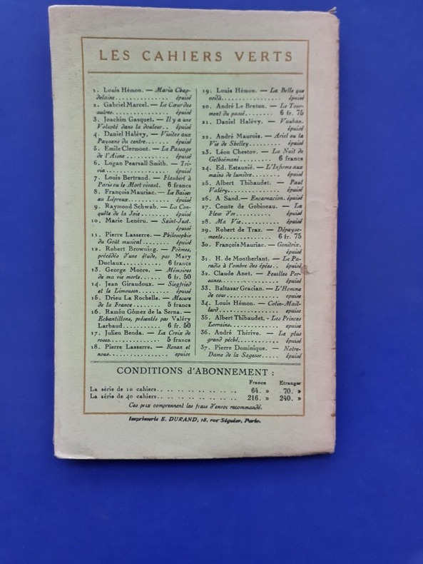 Paris Bernard Grasset 1924 120 pp. In-12 Broché Etat correct 1 volume. Collection " Les Cahiers verts", n°38.EDITION ORIGINALE. Un des 6600 exemplaires numéroté sur vergé bouffant.