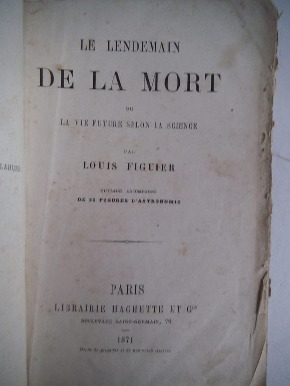 ou la vie future selon la science In 12 broché, dos factice muet faux-titre, titre, XI, 449 pages, 22 figures d’astronomie hors-texte. Paris Librairie Hachette & Cie 1871. Rousseurs. Première édition. C’est à la suite de la mort de son fils que l’auteur a écrit ce livre qui pourrait s’intituler le spiritualisme démontré par la science ( Caillet-3923)