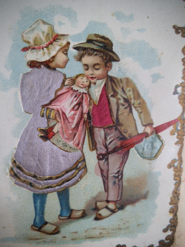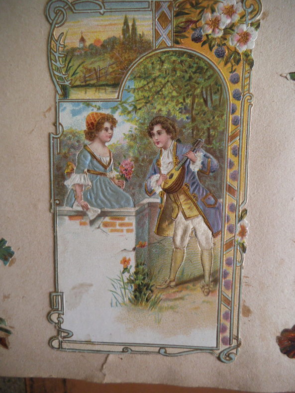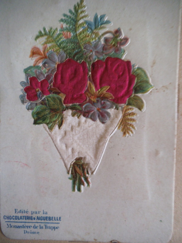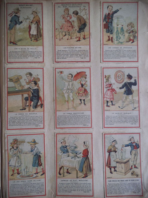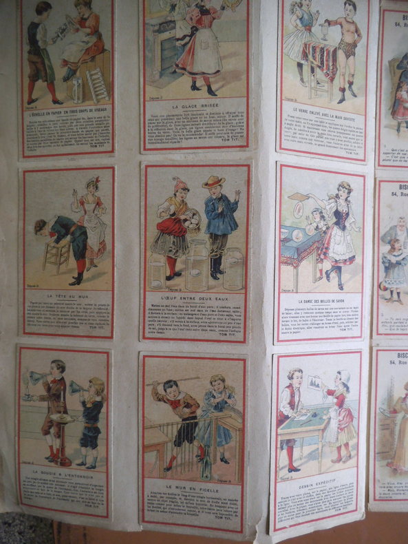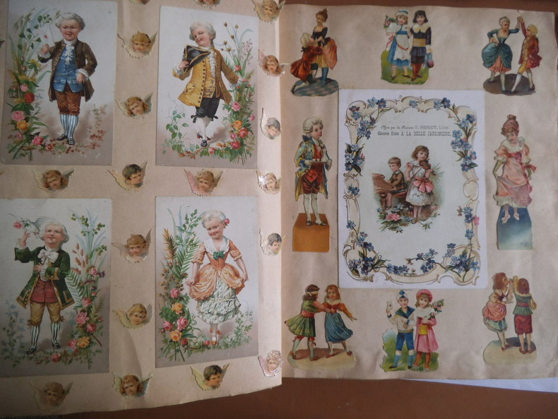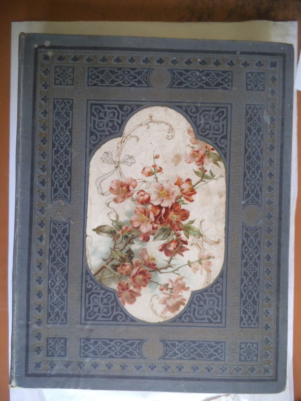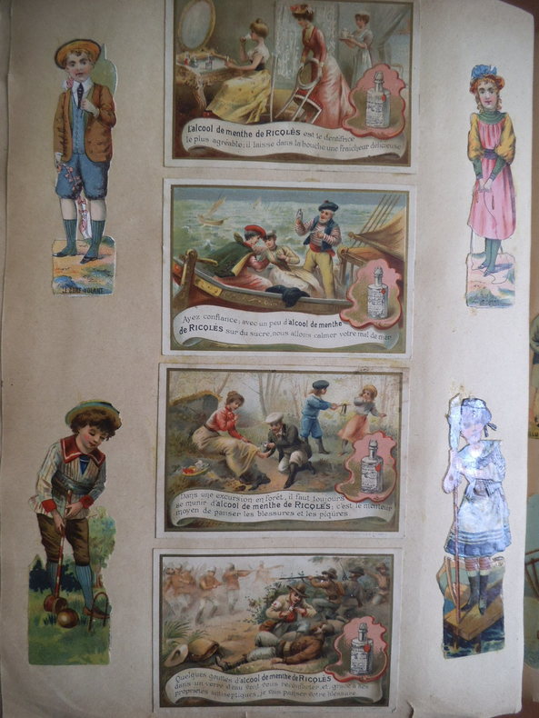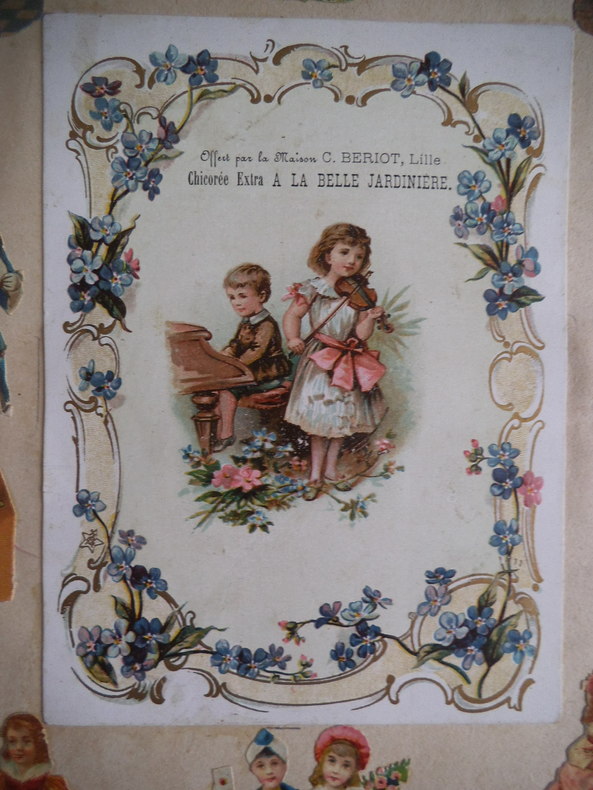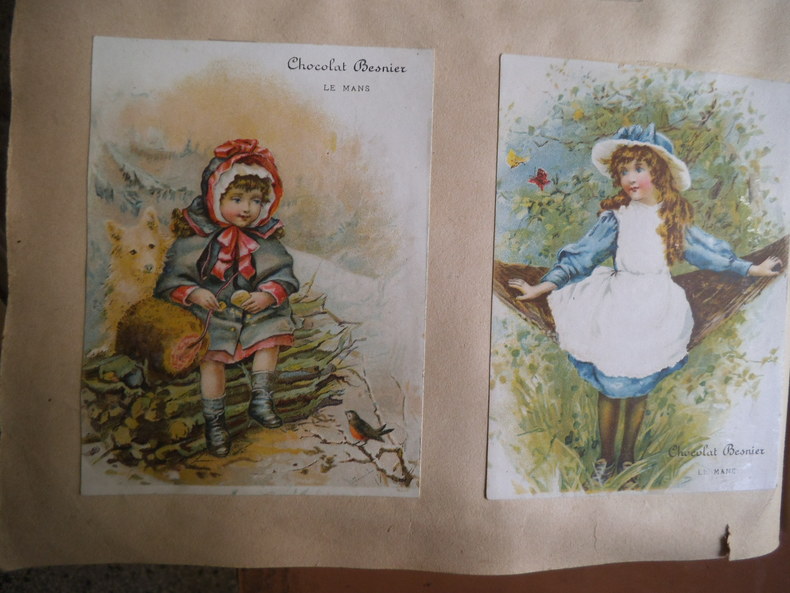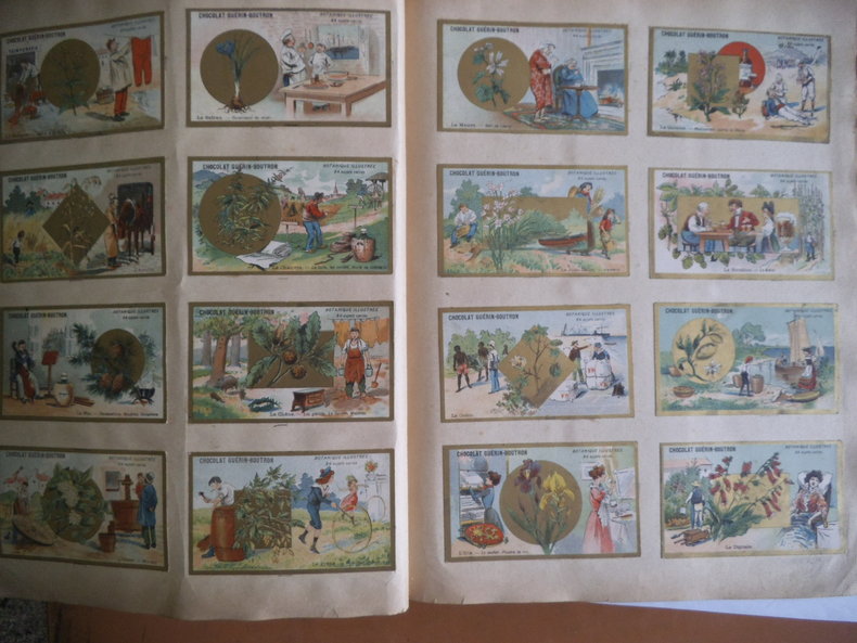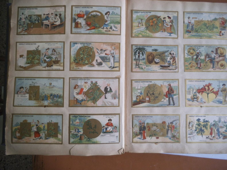 In 4 reliure pleine toile grise, chromolithographie contrecollée sur le premier plat. Frise, grecque et filets en encadrement ; Environ 500 chromos, et plus de 600 découpis. (Oiseaux fleurs, bateaux, vélos, enfants) chromos publicitaires chicorée à labelle jardinière (langage des fleurs)- Chicorée Arlatte (Hamlet)- Chocolat d’Aiguebelle- (guerre de 1870)-chocolat inimitable-chicorée du docteur- chicorée à la ménagère- cotons à coudre extra d’Alsace N. Schlumberger & Cie Guebwiller- Chocolat le mans Besnier- chocolat Guérin- chocolat Poulain- Biscuits Guillon Tom Tit 27 chromos-Biscuit Pernot (Histoire de France 21 chromos etc…)- chicorée Casier Bourgeois (la poste 12 chromos)-menthe Ricqulès- etc. Très bon état d’ensemble.