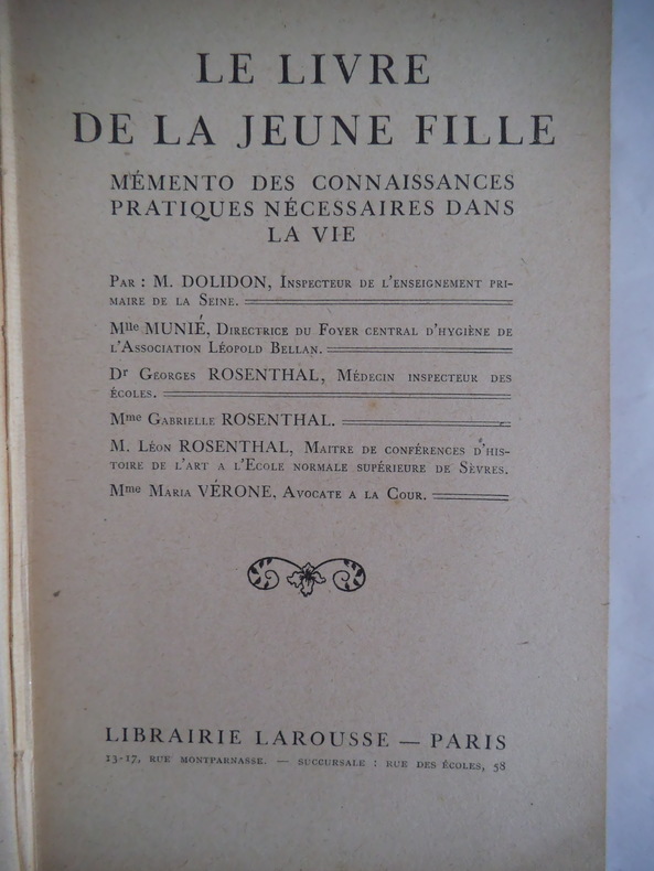 mémento des connaissances pratiques nécessaire dans la vie par MM DOLIDON, ROSENTHAL Mesdames MUNIE, ROSENTHAL, Maria VERONE. In cartonnage de l’éditeur à décor passe partout avec tire ue le premier plat. Faux-titre, titre, 256 pages, illustrations dans le texte et à pleine page. Librairie Larousse Paris sans date,
