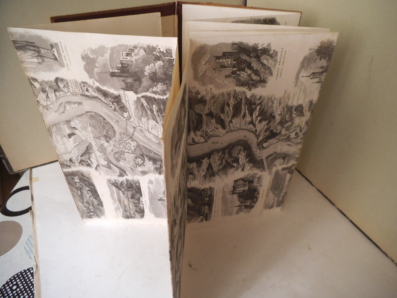 1840-1842 (2nd ed.) 32, [6] p., 1 very large (25.5 x 282 cm) folded lithographed leporello plate / map showing this part of the Rhine with in the margins figures of the most important buildings to be found there, orginal printed boards (black spine). Two tiny tears in the fold, and some slight marginal foxing, else good copy of this rather original depiction of the Rhine’s course. Text book in French.