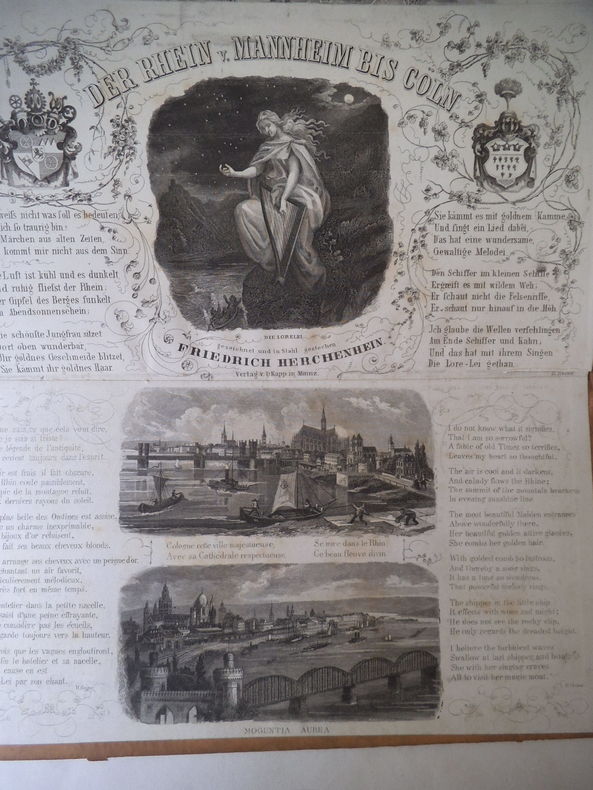 De Mayence à Cologne. Nouvelle édition ornée de paysages dessinés d’après nature et des statues, tant anciennes que modernes, des hommes de lettres, célèbres de ce fleuve. In 8 format 30x17cm en accordéon, couverture cartonnée avec titre, lithographiée. Format déplié 247cm déplié, complet de l’apport de 20 pages. Mayence chez l’éditeur D. KAPP sans date (1869 ?)