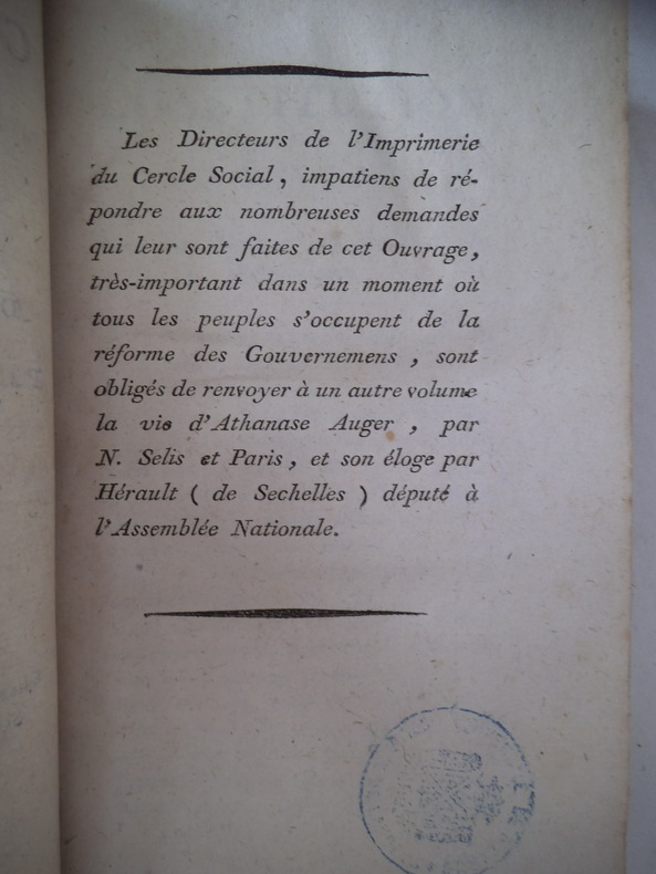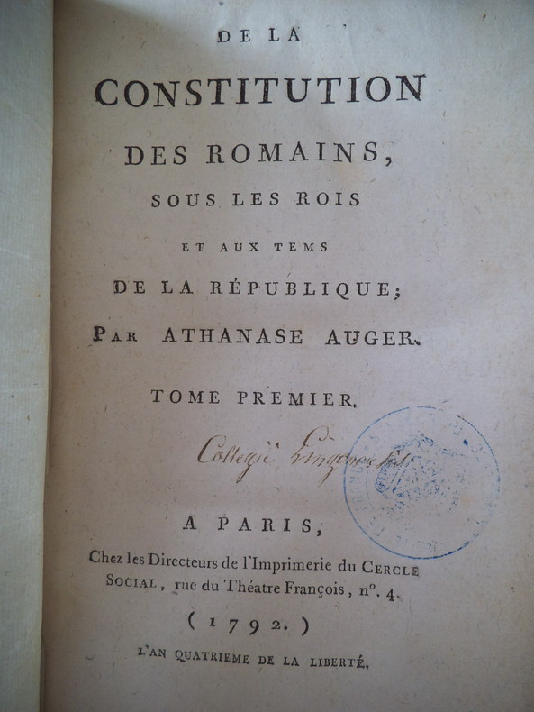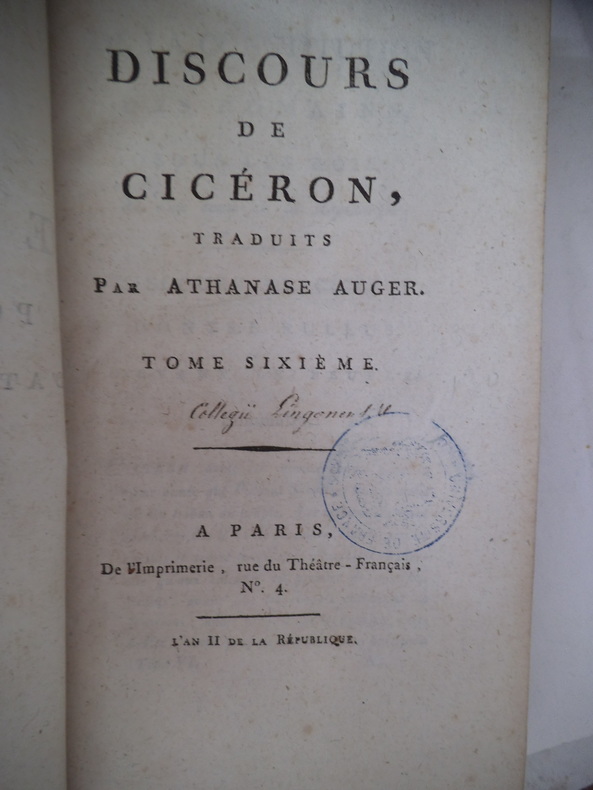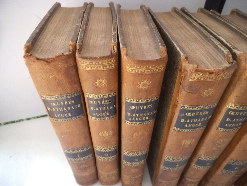 9 tomes en 9 volumes (sur 10) in 8 demi-cuir fauve. Paris chez les directeurs de l’imprimerie du cercle social 1792-L’An quatrième de la Liberté. Tomes 1-2-3-4 : De la Constitution des Romains sous les rois et au temps de la République. Tomes 5-6-6-8-9 : Discours de CICERON, traduits par Athanase AUGIER. De l’imprimerie du cercle social l’an II de la République Française Une et indivisible. Quelques défauts à quelques coiffes, cuir frotté par endroits. Quelques traces de colle (d’étiquettes ?) en pied, à quelques volumes.