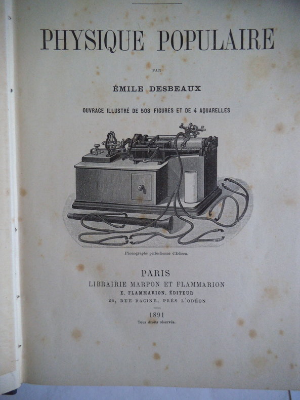 Librairie d'éducation hatier 1890 835 pages in4. 1890. Reliure editeur. 835 pages. Physique populaire par Émile Desbaux ouvrage illustré de 508 figures + 4 hors-texte en couleurs (mirage - foudre globulaire - aurore boréale - phénomènes lumineux) en bon état (énergie sonore : phonographe téléphone téléphonographie téléphote ; l'énergie électrique ; l'énergie lumineuse ; l'énergie calorifique; etc.)