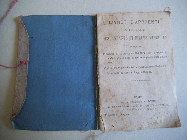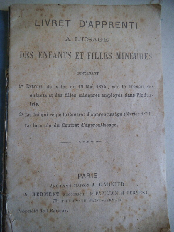 Livret d’apprenti à l’usage des enfants et filles mineures. Contenant 1) extrait de la loi du 19 mai 1874 sur le travail des enfants et des filles mineures employés dans l’industrie. 2) la loi qui règle le contrat d’apprentissage (1851) la formule du contrat d’apprentissage. Paris ancienne maison J. GARNIER A HERMENT successeur.1874. In 16 broché, toilé. Peu courant