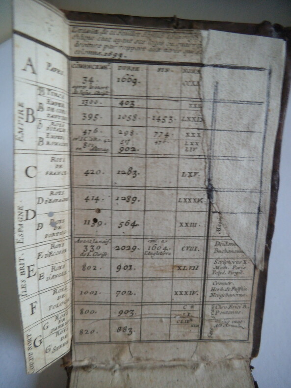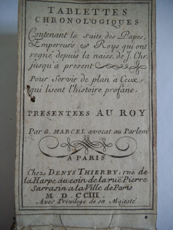 Ce petit livre, au format d'une carte à jouer, peut servir d'aide-mémoire à celui qui étudie l'histoire. Les feuillets sont entièrement gravés. Après le titre et la dédicace au roi, on trouve une gravure allégorique représentant une statue sur un piédestal avec la légende : "Imperium Ludovice, tuum samanque perenne caetera procut cans tempus ad sero". Suit un mode d'emploi des "Tablettes", puis 17 pages correspondant à la chronologie des 17 siècles passés. Au verso de ces pages sont les tables alphabétiques des noms de personnes qui renvoient par des lettres et sigles aux feuillets précédents. Le premier feuillet sur le premier contreplat donne le sens des symboles et abréviations utilisés ; le dernier feuillet présente un tableau avec un petit rabat. Guillaume Marcel (1647 à Toulouse, 27 décembre 1708 à Arles) est issu d'une vieille famille. Il étudie le droit à Toulouse puis devient député et bibliothécaire à l'abbaye Saint-Victor à Paris. Il fut alors nommé ambassadeur et envoyé à Constantinople. En 1677, il fut envoyé comme ambassadeur en Algérie pour négocier la paix avec les îles Barbaresques. Le traité de paix a été conclu la même année. Après un court séjour en Égypte, il est nommé commissaire naval à Arles. Il a publié dès 1632 des "Tablettes chronologiques pour lhistoire de lÉglise et pour lhistoire profane", puis un grand tableau chronologique de "L'histoire de la monarchie française" en 4 volumes in-12. (Ludwig-Maximilians-Universität München).