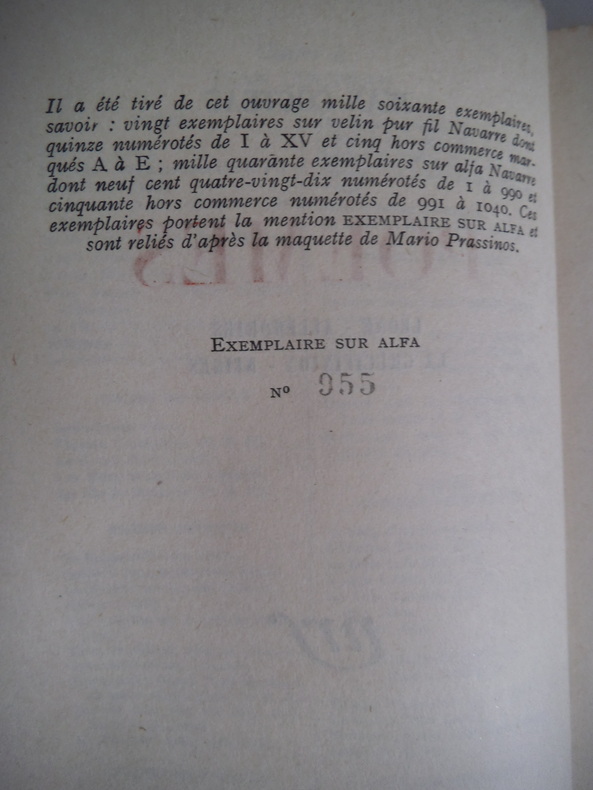 In 12 cartonnage de l’éditeur d’après la maquette de Mario PRASSINOS. Exemplaire sur alfa n°955. 158 pages. NRF 14 mais 1948. Très bon état