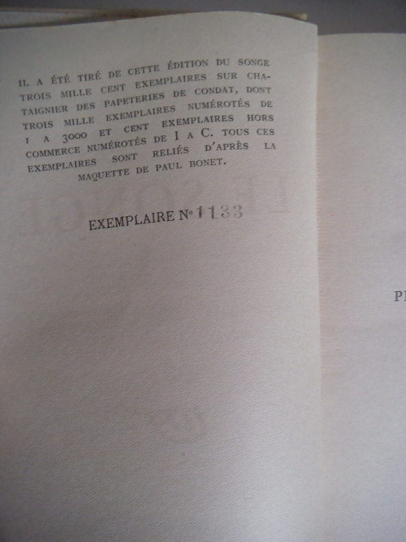 ed. de Minuit 1982 et 1990 Monsieur Songe, ed. de Minuit, 1982, in-12 br., « Pendant une vingtaine d’annees je me suis delasse de mon travail en ecrivaillant les histoire de monsieur Songe. Les voici reunies et mises au point en un volume qui est, je le repete, un divertissement ». 1er mille, envoi, Du nerf, ed. de Minuit, 1990, in-12 br. etroit, où l’on retrouve Monsieur Songe.. ça se finit comme ça : « On ne connait pas la decision de monsieur Songe mais on espere qu’il finira paisiblement », 1er mille, envoi, les deux volumes