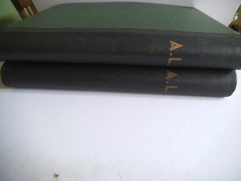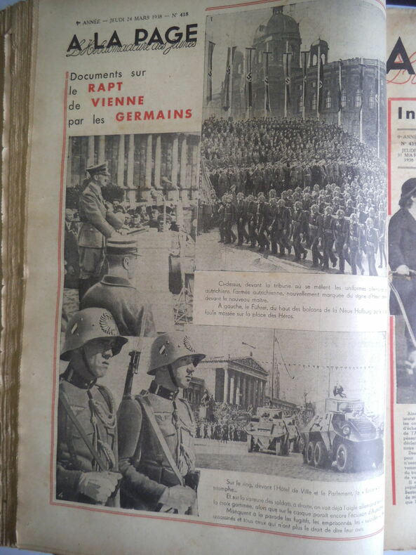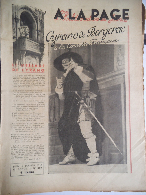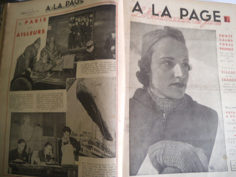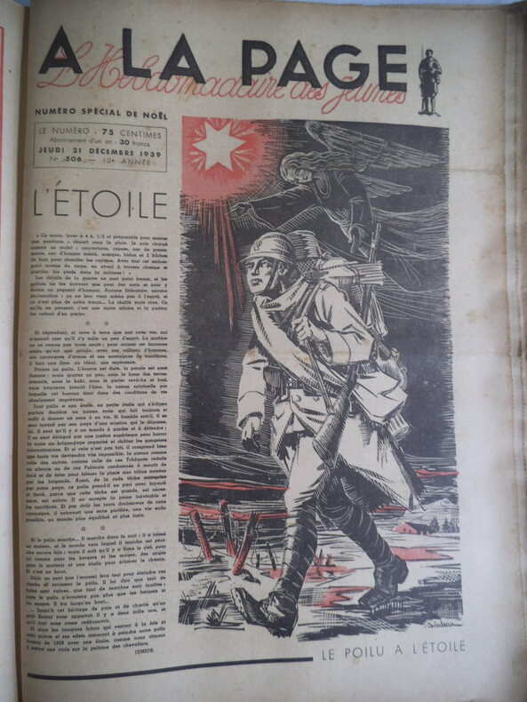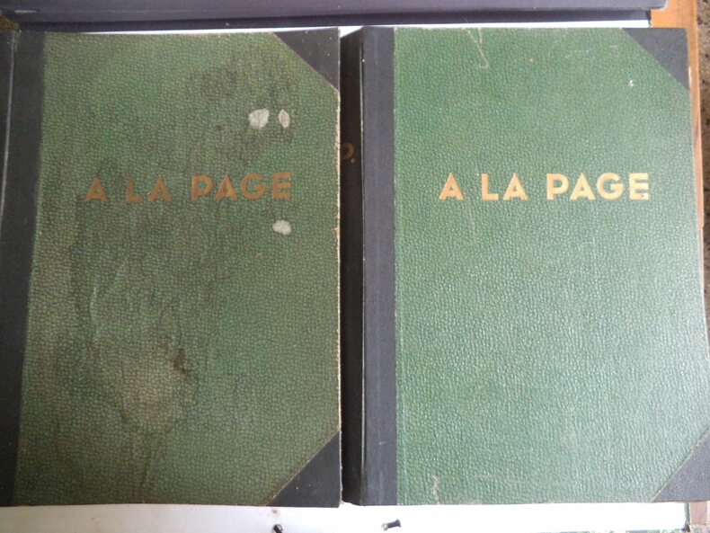 A LA PAGE. l’hebdomadaire des jeunes. In folio, 16 pages illustrées, texte sur 3 colonnes. Neuvième année 1938 n° 408 du 6 janvier au n° 458 du 29 décembre. Dixième année 1939 : n°459 du 5 janvier au n° 507 du 28 décembre 1939. En deux reliure éditeur demie toile à coins, plats cartonnés verts, avec titre doré au premier plat cartonnées. On joint de la onzième année 1940, les n° 508 du jeudi 4 janvier au n° 525 du jeudi 2 mai 1940. (Dernier paru ?) Fort rare. Très bon état