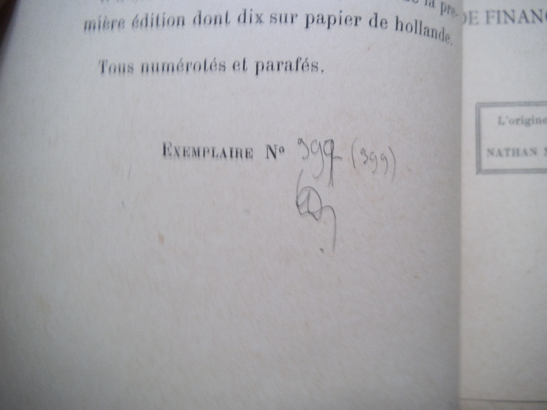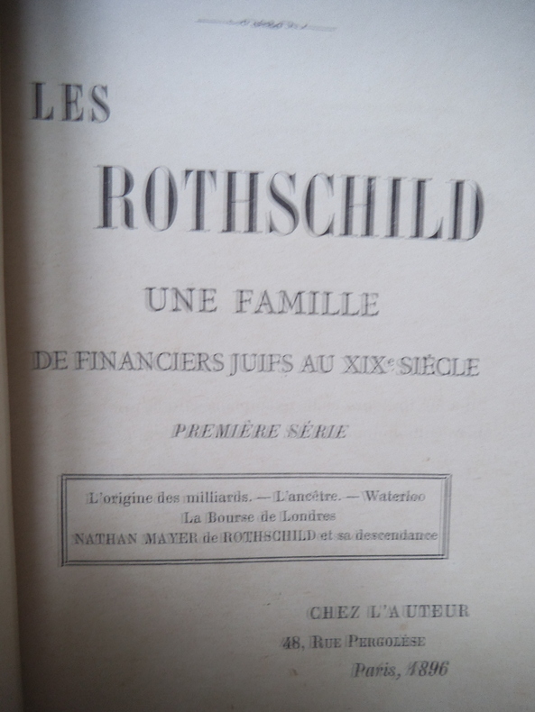 Première série : l’origine des milliards- l’ancêtre- Waterloo- la bourse de Londres- NARHAN MAYER de ROTSCHILD sa descendance. In 12 broché, 120x185mm. faux-titre, titre, XLI-194pages. 2 tableaux généalogiques dépliants en fin de volume. Chez l’auteur 18 rue Pergolèse Paris 1896. Edition originale numérotée 399 et paraphée par l’auteur, à la plume. Très bon état