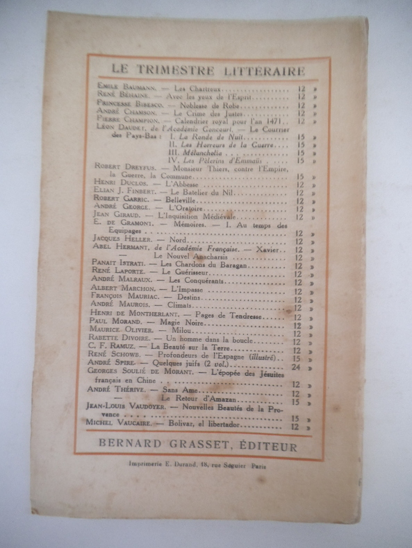 in 12 broché, 120x190mm. Faux-titre titre, 190 pages Bernard Grasset 31 janvier 1929. Couverture doublée. Petit manque en pied réparé. Bon état d'ensemble
