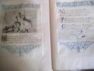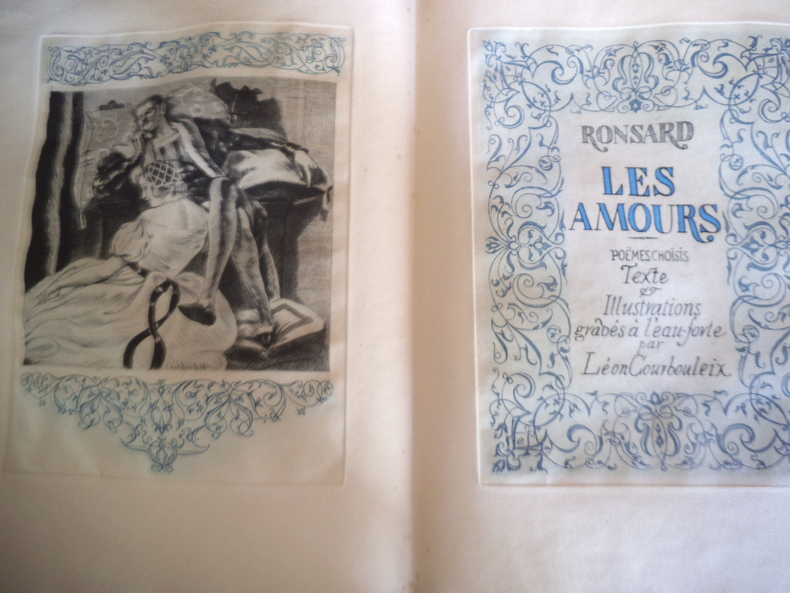 Les amours poèmes choisis, texte et illustrations gravés à l’eau forte par Léon COURBOULEIX In 4 en feuillets, couverture à rabats, 260x330mm, Frontispice, titre, 74 pages, Ce livre contient 59 planches dont les ornements, le texte & les illustrations ont été gravés à l’eau forte. Chaque planche a été imprimée à la poupée en plusieurs couleurs sur la presse à bras de l’artiste, les lettres capitales ont été rehaussées de gouache et d’or à la main. Exemplaire sur Arches, d’artiste nominatif à la main avec signature de Léon COURBOULEIX , étui cartonné (L84 Steph)