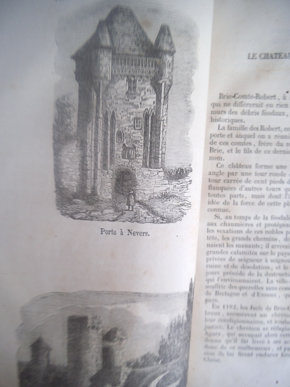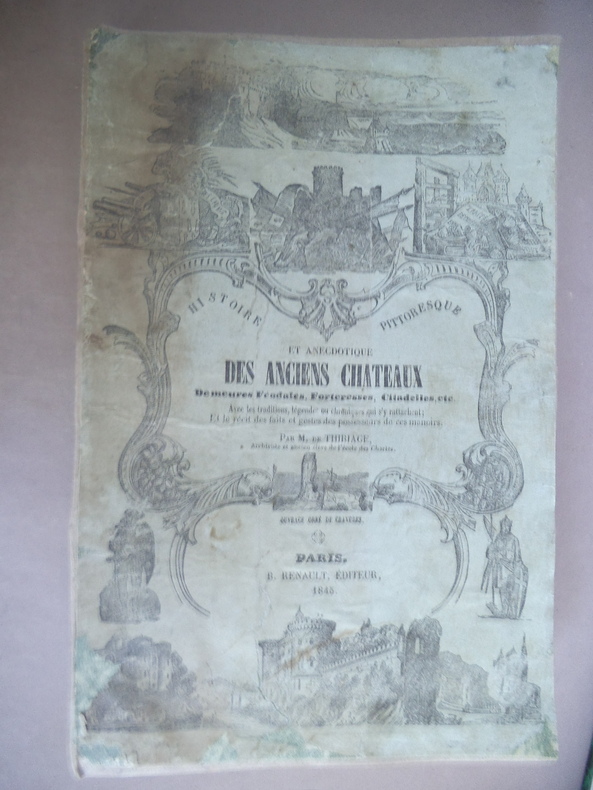 Histoire pittoresque et anecdotique des anciens châteaux, demeures féodales, forteresses, citadelles etc. Avec les traditions, légendes ou chroniques qui s’y rattachent et le récit des faits et gestes dues possesseurs de ces manoirs. In 8 broché, couverture mateur cartonnée souple, plats de couverture lithographiés, contrecollés, dos muet. 155x245mm. Titre, 212 pages. Nombreuses gravures en noir (52), la plupart hors texte. Paris B.RENAULT libraire éditeur 1846. (Taches brunes en marges inférieures et supérieures, en début et fin de volume. Voir photos 4 et 9) non rogné.