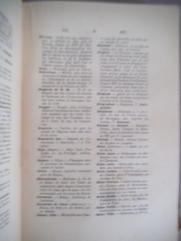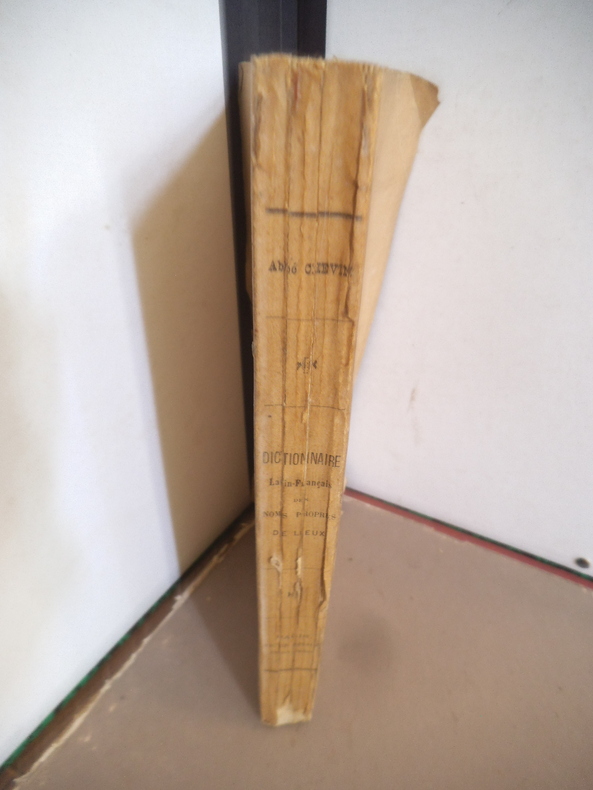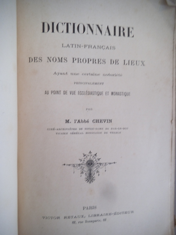 Dictionnaire latin français des noms propres de lieux ayant une certaine notoriété principalement du point de vue ecclésiastique et monastique. In 8 broché, 140x230mm, faux –titre, titre, 358 pages, Paris Victor LECOUX libraire éditeur. Couverture poussiéreuses, dos cassant.