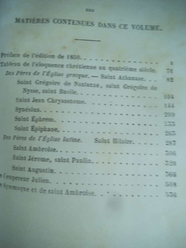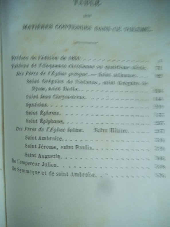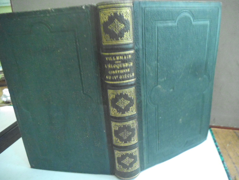 Tableau de l’éloquence chrétienne. Du polythéisme-des pères de l église grecque- des pères de l’église latine- de l’empereur Julien- de symmaque de saint Ambroise Librairie académique Didier & Cie 1870. in 12 demi chagrin vert à nerfs 125x180mm, poids 540 grammes titre roulette, caissons dorés, plats percaline chagrinée verte, filets à froid en encadrement. Faux-titre, titre, VIII, 537 pages, 1 page de table
