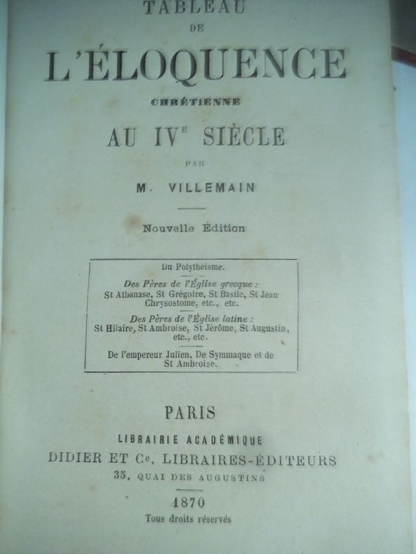 Recueil d'études d'Abel-François VILLEMAIN (1791-1870), député de l'Eure en 1830, universitaire, ministre de l'instruction publique en 1839 et 1840-1844: "Du polythéisme dans le premier siècle de notre ère", "Tableau de l'éloquence chrétienne au IVe siècle": pères de l'Eglise grecque et pères de l'Eglise latine, "De l'empereur Julien", "De Symmaque et de saint Ambroise". Mention de "nouvelle édition", avec préface de la réédition revue et augmentée de 1850. Exemplaire relié.
