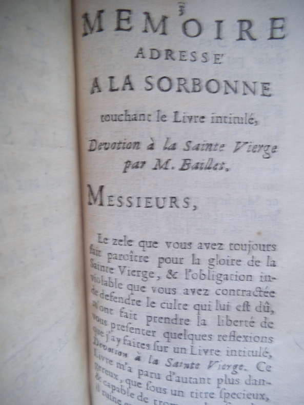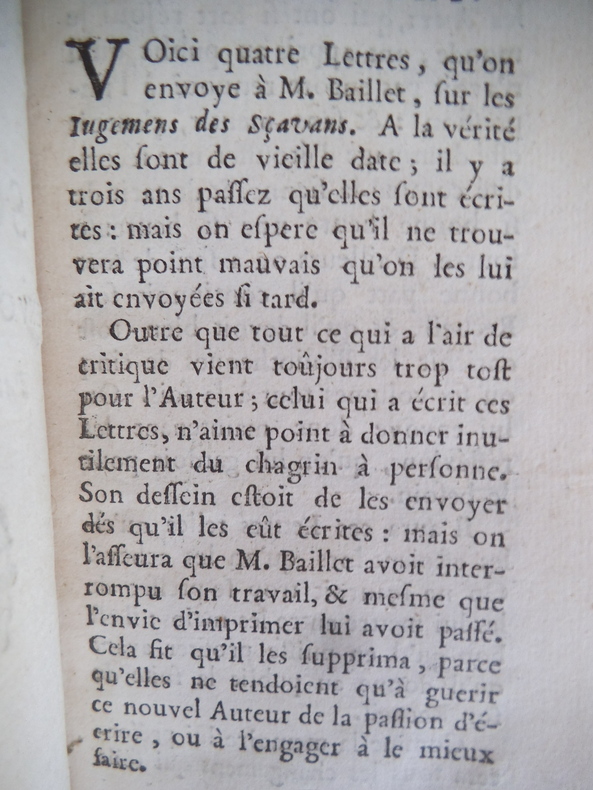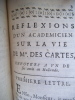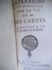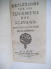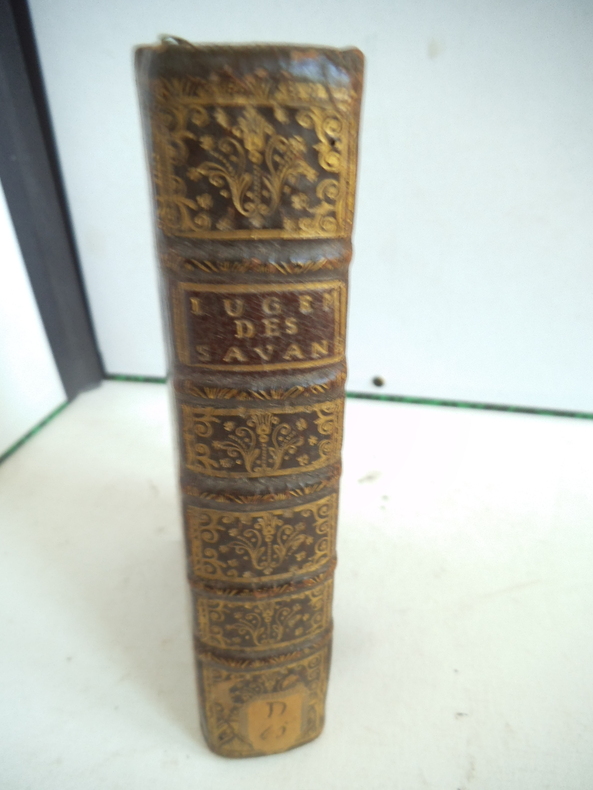 Réflexions sur les jugemens des scavans envoyées à l’auteur par un Académicien. In 12 plein cuir fauve raciné à nerfs, pièce de titre chagrin rouge, roulette, filets, caissons, fers dorés. Roulette dorée sur coupes Titre à la sphère, 215 pages, A La Haye Arnout LEERS 1691. A la suite réflexions d’un académicien sur la vie de M. DESCARTES envoyées à un de ses amis en Hollande titre à la sphère; 180pages A La Haye chez Arnout Leers 1692. Suivi de mémoire adressé à la Sorbonne touchant le livre intitulé dévotion à la Saint Vierge par M. BAILLET 1693 titre, 44 pages et seconde lettre à M. HYDEUX 45 pages, troisième lettre à M. HYDEUX 39 pages, tranches rouges.