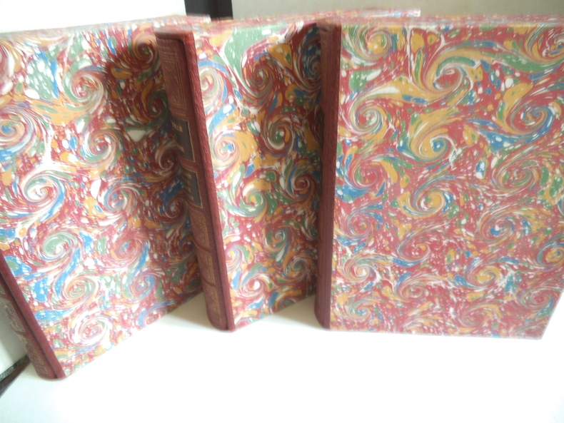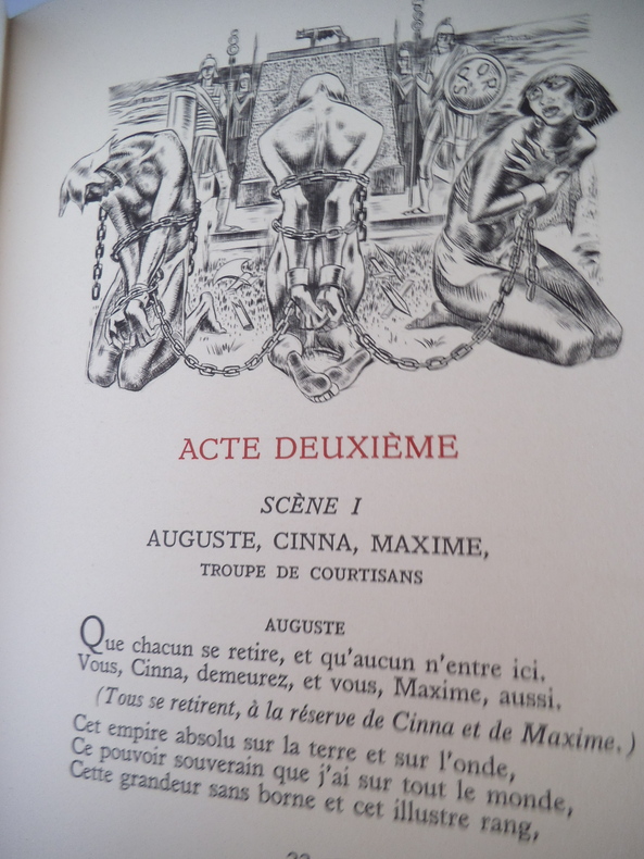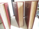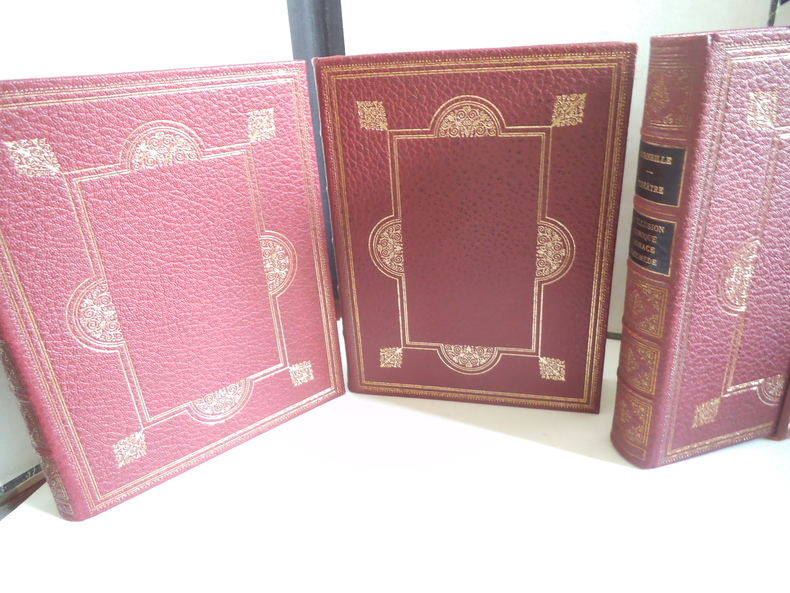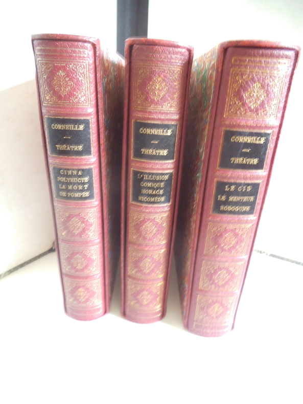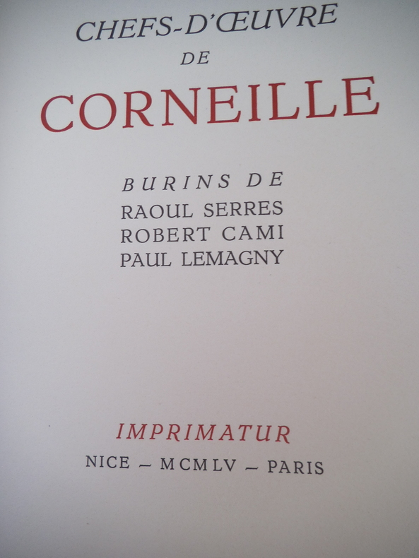 Trois tomes en trois volumes in 8 carré, 195x250mm, plein cuir rouge façon chagrin, à nerfs, pièce de titre cuir bleu. Caissons dorés. Filets, roulette écoinçons dorés sur les plats. Non rogné, tête dorés. Faux titre, titre, imprimatur NICE 1954. Exemplaires numérotés sur vélin pur fil teinté 1) Le Cid- Le menteur- Rodogune. 303 pages. Illustrations hors texte de Raoul SERRES 30 juillet 1954. 2) L’illusion comique, Horace, Nicomède, 283 pages, illustration de Robert CAMI 30 mars 1955 .3) Théâtre, Cinna, Polyeucte, la mort de pompée 272 pages, 30 juillet 1955. Illustrations de Paul LEMAGNY Etuis cartonnage bordés du même cuir rouge. Ensemble en très bon état.