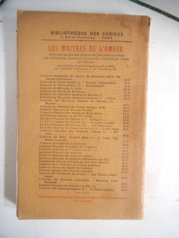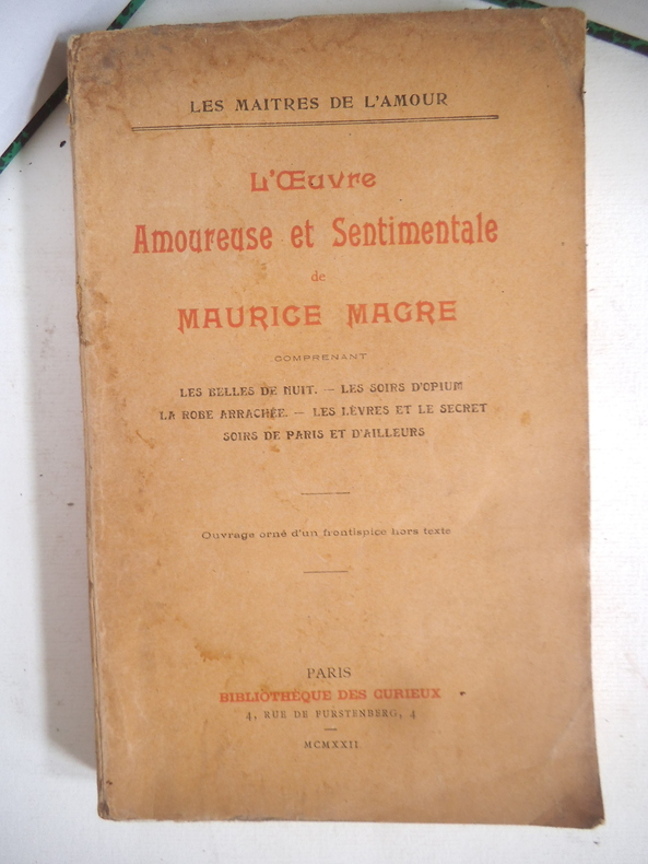 Paris Bibliothèque des Curieux 1922 in 8 (23x15) 1 volume reliure à la bradel demi percaline moutarde, pièce de titre de cuir bleu, couverture conservée, frontispice, 254 pages [2]. Maurice Magre, 1877-1941. Collection ''Les maitres de l'amour''. Tirage limité à 100 exemplaires numérotés, celui-ci un des 25 exemplaires numérotés sur Japon impérial, tirage de tête. Bel exemplaire, bien relié ( Photographies sur demande / We can send pictures of this book on simple request )