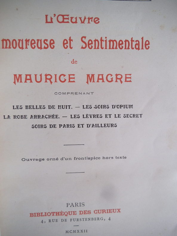 Comprenant les belles de nuits- les soirs d’opium- la robe arrachée- les lèvres et le secret- Soirs de Paris et d’ailleurs. In 8 broché, 230x145mm, faux –titre, frontispice portait de l’auteur par CHIMOT (1922) titre, 254 pages, 4 pages de catalogue, non coupé, Paris Bibliothèque des curieux 1922. Traces légères au premier plat, couverture modeste, intérieur en très bon état.