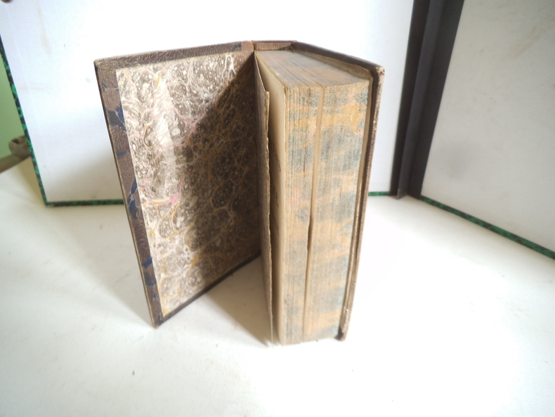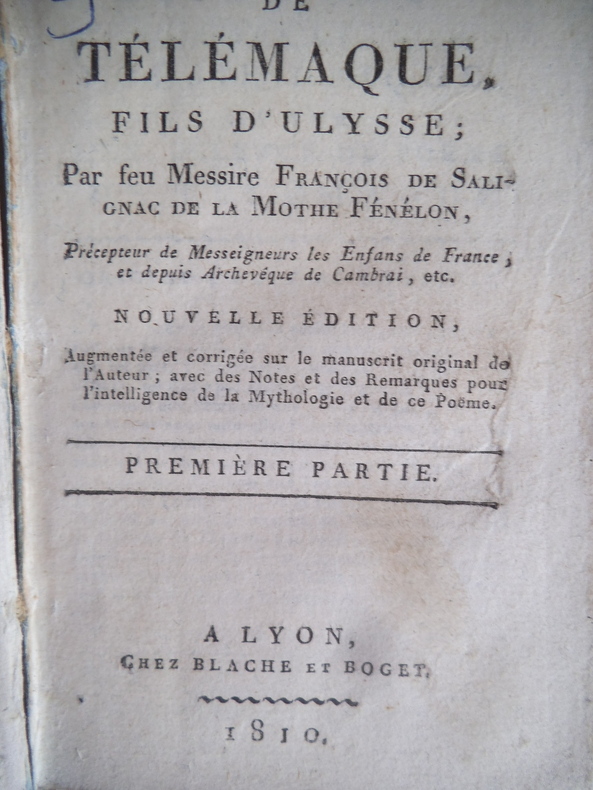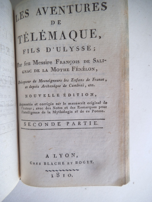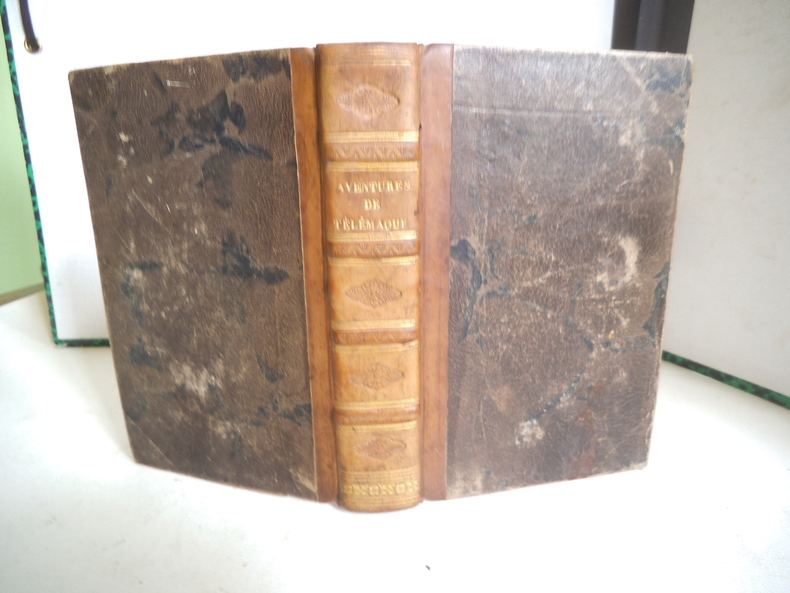 Les aventures de Télémaque. Nouvelle édition deux parties en un volumes in 12 demi cuir fauve ( 90x140mm) titre, roulette, filets dorés. Faux titre, titre, 215 pages, faux titre, titre 246 pages. A Lyon chez Blache et Boget 1810. Bon exemplaire