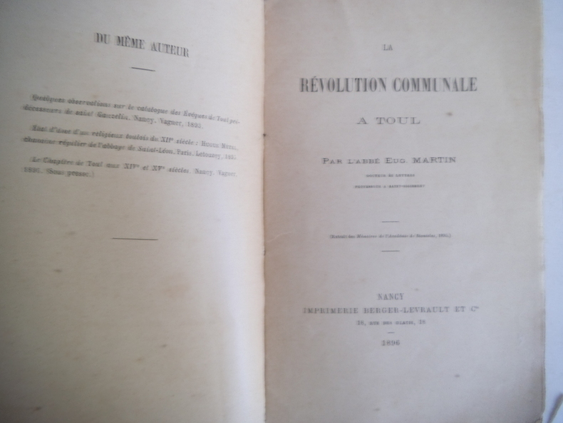 In 8 broché, couverture illustrée de J. POITTE 220x140mm. Faux titre, titre, 89 pages, plan dépliant en couleurs de TOUL au XVIIIème siècle et au XIXème siècle. Nancy BERGER LEVRAULT éditeurs 1896. Couverture doublée avec de petites restaurations en marges inférieure