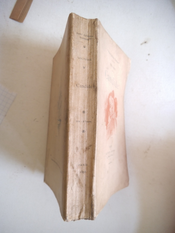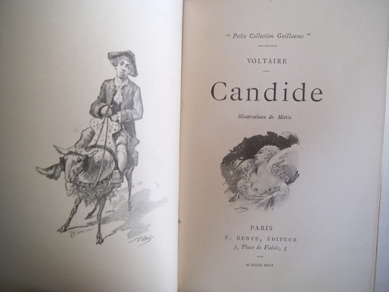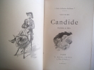 préface de Francisque Sarcey, illustrations de Adrien Moreau Candide est un conte philosophique. Il a pour personnage principal un jeune homme, Candide, qui vit dans un château avec sa cousine, Cunégonde, et son oncle. Il y est éduqué par un précepteur philosophe, Pangloss, qui suit la théorie de Leibniz, philosophe du XVIIe siècle, selon laquelle, notamment, « tout est pour le mieux dans le meilleur des mondes possibles ». Candide adhère d’abord à cette idée ; mais lorsque son oncle le chasse du château après l’avoir surpris en train d’embrasser Cunégonde, la vie va lui faire revoir cette opinion. Candide va en effet traverser une série de péripéties qui seront autant d’épreuves. Il se bat contre les Abares et découvre les horreurs de la guerre ; il assiste à la mort de milliers d’hommes et de femmes lors du tremblement de terre de Lisbonne ; il est condamné à mort injustement et en réchappe comme par miracle ; il découvre la manière cruelle dont sont traités les esclaves noirs, et finit par se réfugier en Turquie. Sur son chemin, il perd et retrouve tour à tour Pangloss et Cunégonde. A la fin du conte, ils vivent tous ensemble en Turquie et se contentent de « cultiver leur jardin », c’est-à-dire de s’occuper de leurs affaires privées sans plus se mêler du monde. « Il faut cultiver son jardin » est en effet le mot final du derviche, un mystique et sage de confession musulmane. Les principaux thèmes de cette œuvre sont ainsi le bonheur, la justice, l’ordre du monde et la politique. volume in-4, 255x170, jolie reliure, dos à nerfs, tranches de tête dorée, bel état intérieur, 174pp, couvertures d'origines conservées, coins lg. frottés, état intérieur neuf. Paris Jules Tallandier ( collection, " Les chefs d’œuvres de l'esprit " ), sans date, vers 1900 ref/241