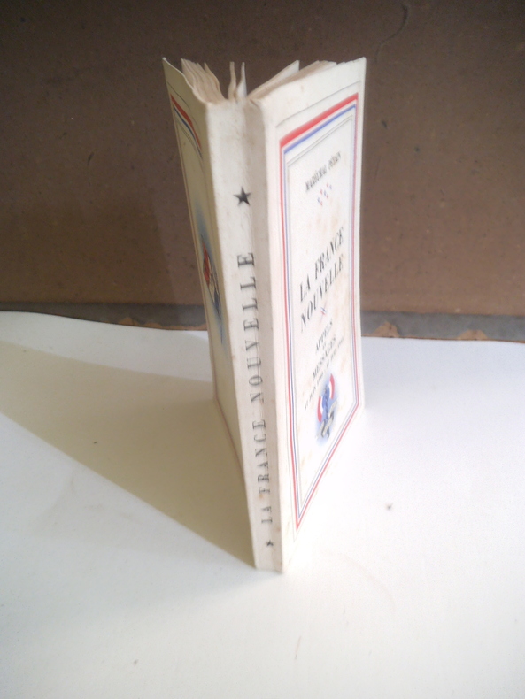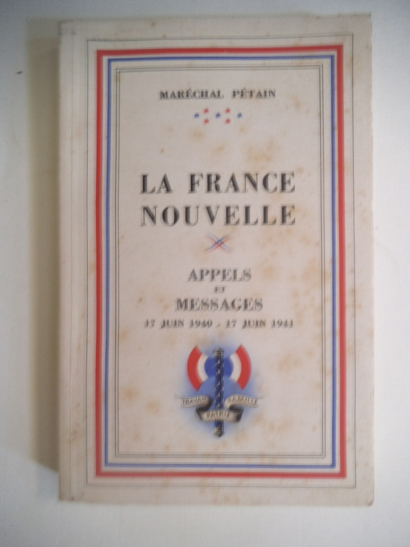 PETAIN Maréchal La France Nouvelle Appels et messages 17 juin 1940-17 juin 1941In 12 broché, 180x115mm, couverture illustrée francisque filets tricolores en encadrement. Faux-titre, portait du Maréchal Pétain,, en frontispice, 172 pages, imprimerie Draeger frères septembre 1941. Petites rousseurs sur la couverture, intérieur très bon état.