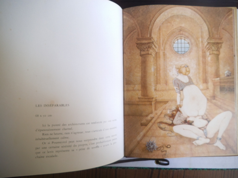 Editions Eric Losfeld 1972. In-4 cartonnage éditeur plein skyvertex bordeaux. Couvertures muettes. Dos carré. Plats et intérieur frais. Complet de la jaquette illustrée, qui présente de très minuscules frottis aux coins et de légères traces d'insolation aux bords. Contient 30 dessins reproduits en couleurs à pleine page, légendées par Raymond Borde, qui a aussi rédigé la préface. Superbes dessins érotiques, fortements influencés par Hans Bellmer. Tirage sur couché. Edition originale en très bel état général. Rare exemplaire orné d'une cordiale dédicace autographe, signée, de Jean-Marie Poumeyrol.