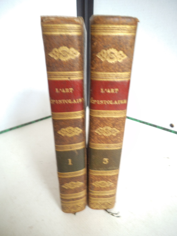 L'Art épistolaire ou dialogues sur la manière de bien écrire les lettres.Ouvrage divisé en deux partie;Les préceptes et les modèles pour servir à l'instruction de la jeunesse.Deux volumes sur trois.In 12 plein cuir fauve raciné,dos lisse, pièce de titre cuir rouge,pièce de tomaison cuir vert,fers, roulette,filets dorés.Filets dorés sur coupes.Tranches marbrées.A.Dôle de l'imprimerie deJ .B JOLY 1825.Volume 1 et volume 3.Tome premier:faux titre, titre, XVIII 296 pages; pâle mouillure angle supérieur droit jusqu'à la page VIII. plus ou moins fortes.Tome 3 363 pages rousseurs en fin de volume.135X90mm.