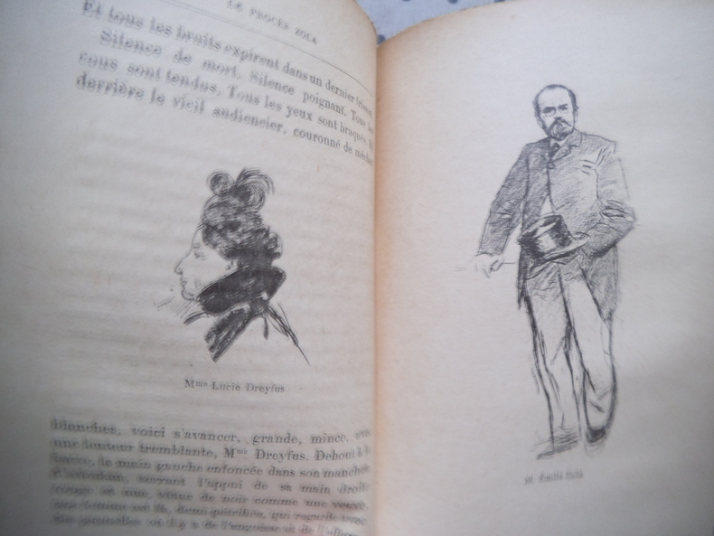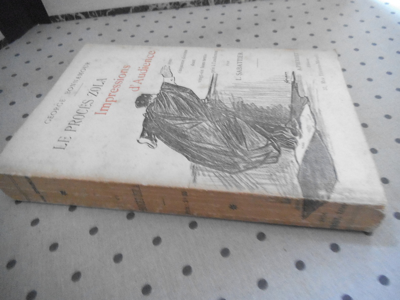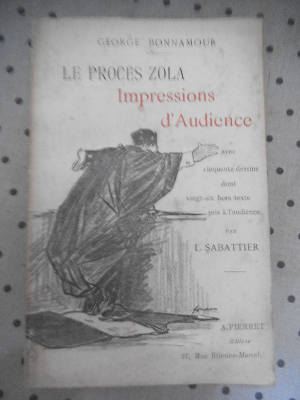LE PROCÈS ZOLA impressions d'audience Georges Bonnamour avec 50 dessins dont 26 hors texte pris à l'audience par L.Sabattier édition augmentée de ; la Genèse de l'affaire Zola, une heure chez l'expert Belhomme, lettres aux intellectuels vol broché, 180x130, couverture illustrée, pages non coupées, bon ex. 288pp, rare ! Paris Pierret 1898 ref/c59