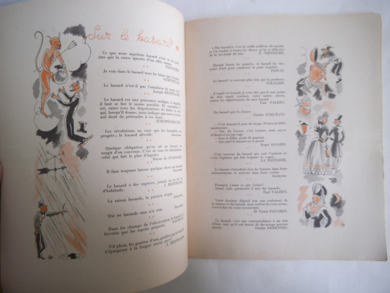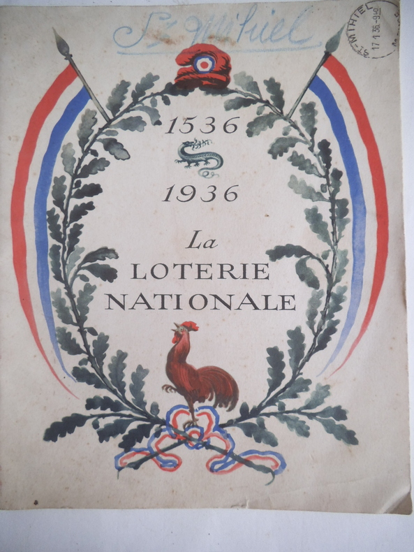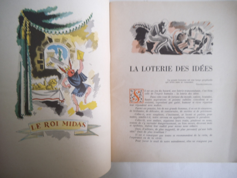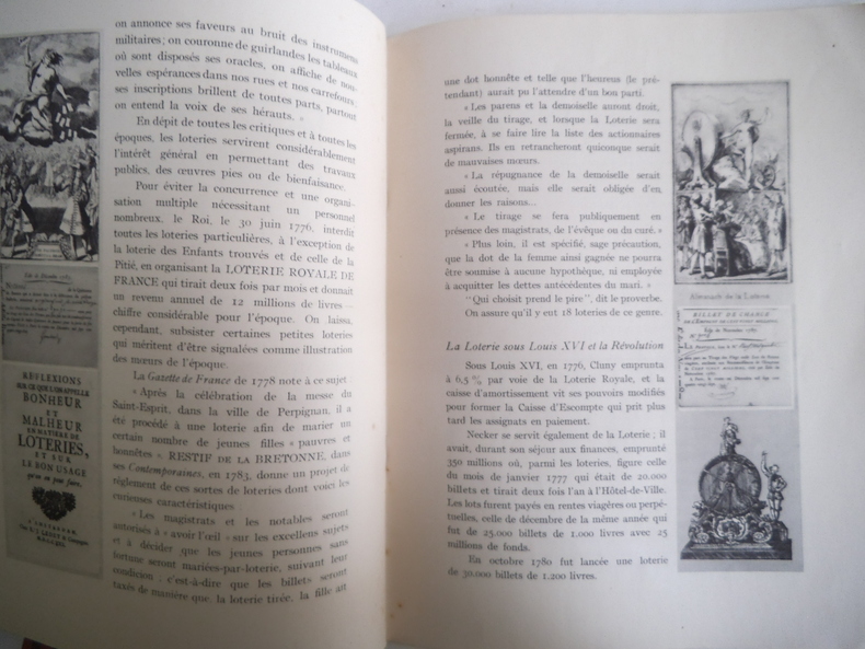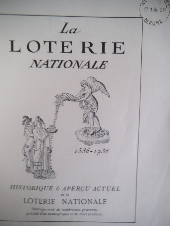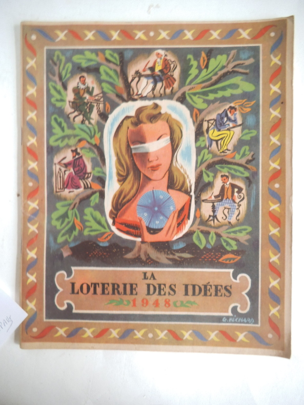 Deux volumes in 4 brochés.1)La loterie des idées.In 4 broché,couverture illustrée en couleurs de G.PICHARD. 215X260mm.Titre illustré en couleurs.32 pages,Illustrations en couleurs dont une double page centrale.Dictons-citations- de Sénèque,COURTELINE,Alexandre DUMAS,BOSSUET,ALAIN.Achevé d'imprimer le jour de la Saint Marcel de l'an de chance 1948,illustrations en couleurs pour les pensées sur la loterie,le hasard,la fortune,l'argent,la richesse,le sort, la chance,la pauvreté et l'espérance ont été choisies et présentées par M.CHARPAUX,les illustrations sont de M. LEPRËTRE.Très bon état.2) 1536-1936 La loterie Nationale.In 4 broché couverture illustrée en couleurs 210x260mm,titre illustré,38 pages,illustrations d'après les documents d'époque.E.DESFOSSES graveur imprimeur.Un des exemplaires sur vergé d'arches,non justifié.Très bon état.Tampon Bureau de poste de Saint Mihiel le 17/1/1936.9h 40mm.L'ensemble en très bon état