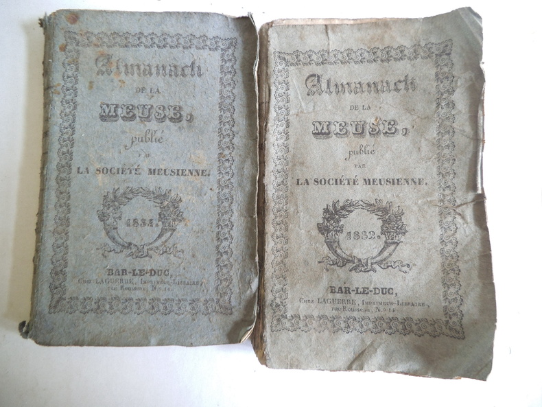 publiés par la Société Meusienne.Année 1832:Un volume broché,45x90mm,couverture imprimée.Titre,216 pages.Se vend à Bar le Duc chez LAGUERRE.Textes:Dictionnaire d'économie agricole,domestique et industrielle de la page 80 à la page 124(avec une intéressante recette pour faire du vin de Champagne),anecdote,éphémérides,dates des foires,salons, découvertes.(angle supérieur du premier plat de couverture sali.Ensemble modeste.On joint Almanach de la Meuse 1834 publié par la Société Meusienne.Un volume broché,45x90mm, couverture imprimée.Titre,volume incomplet des pages 1 à 26 et des pages 89 à 96.Manques au dos,textes:jours de paie des ouvriers de l'agriculture,victoires et conquêtes des français;extrait des temples de la gloire relatif au département de la Meuse, éphéméride.