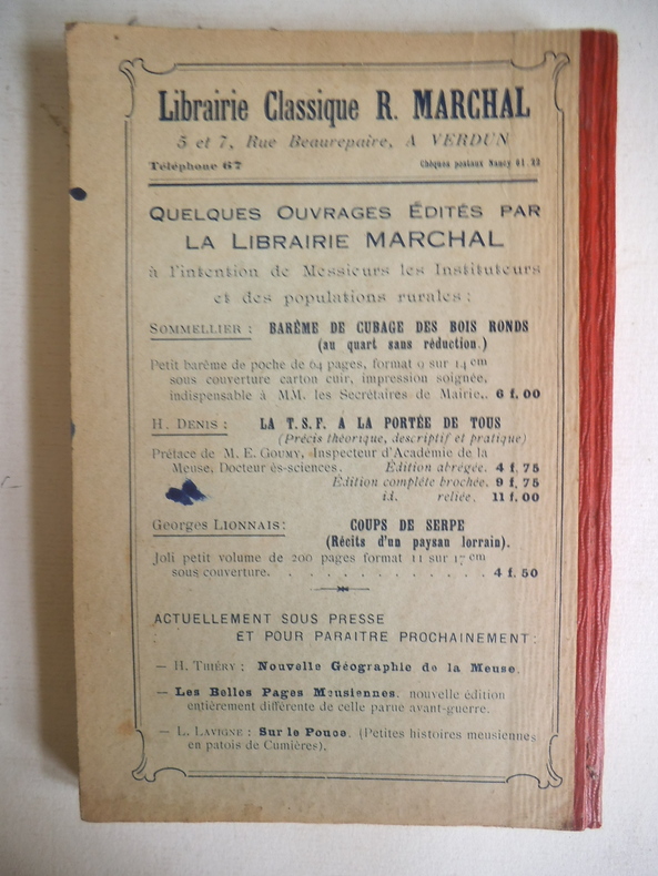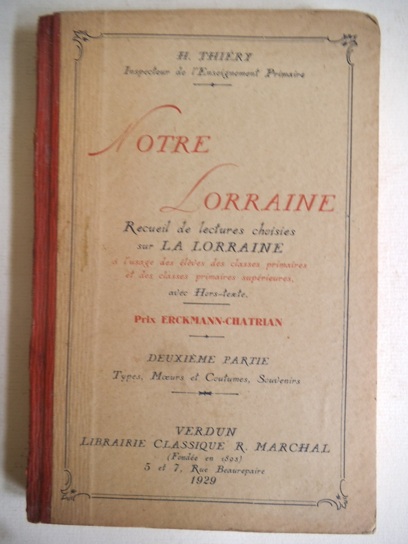 Recueil de lectures choisies sur la Lorraine à l'usage des élèves des classes primaires et des classes primaires supérieurs avec hors-texte.Deuxième partie Types moeurs et coutumes,souvenirs.Verdun Librairie Classique R.MARCHAL 1929.In 12 cartonnage d'éditeur,dos toilé, plats imprimés. 130X190mm.Titre 143 pages,très bon état