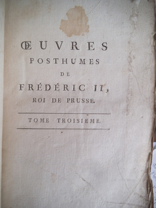 Frédéric II Roi de Prusse.Oeuvres posthumes.Mémoires sur le règne de Frédéric I Roi de Prusse écrits par lui-même:Tome troisième histoire de la guerre de 7 ans,seconde partie.In 8 broché couverture muette d'attente,papier à la cuve. 140X221mm.Faux-titre,titre,XVI avant propos 380 pages.Sans mention d'éditeur 1789.Pâle mouillure angle inférieur droit de la page 369 à la fin.Exemplaire à grands marges.