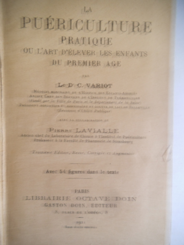 La puériculture pratique.Ou l'art d'élever les enfants du premier âge.Avec la collaboration de pierre LAVALLE.Edition revue,corrigée,augmentée.Faux titre,titre,VIII,403 pages, 54 figures dans le texte.Paris Librairie Octave DOIN. Gaston DOIN éditeur 1921 (poids 380 grammes)
